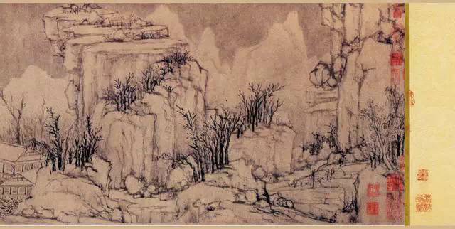 7.董源坡脚下多有碎石。乃画建康山势。董石谓之麻皮皴。坡脚先向笔画边皴起。然后用淡墨破其深凹处。着色不离乎此。石着色要重。