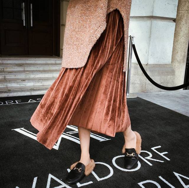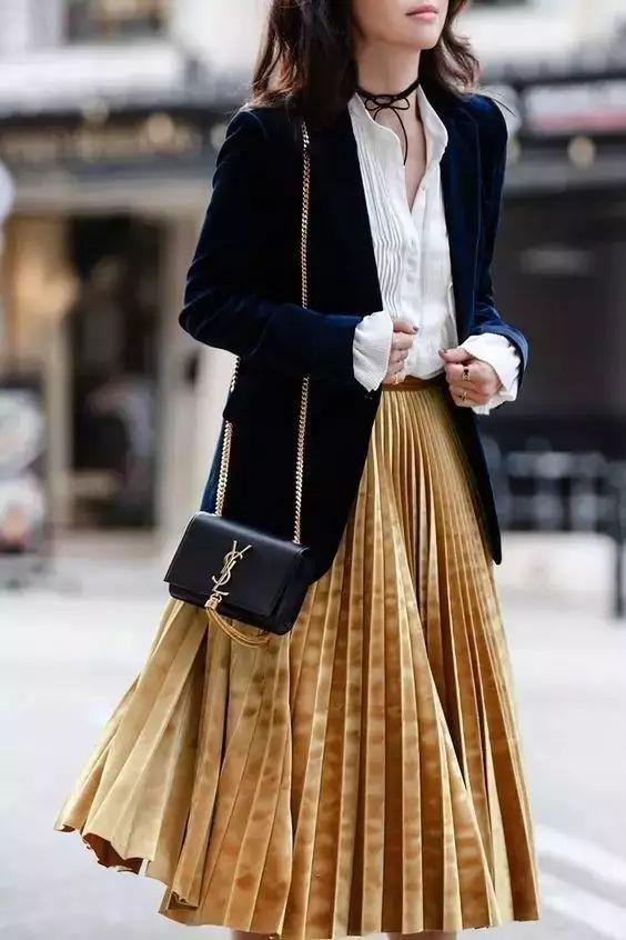 丝绒外套与百褶裙的搭配自然也少不了。