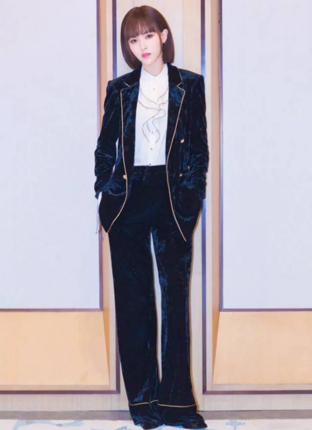 杜鹃暗蓝色丝绒套装,有种干练的美。