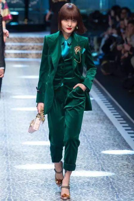 在颜色方面除了暗红,还有墨绿、宝蓝都是很受欢迎的颜色。在搭配中,不论是哪种颜色的套装,白色都是最适合的内搭颜色。