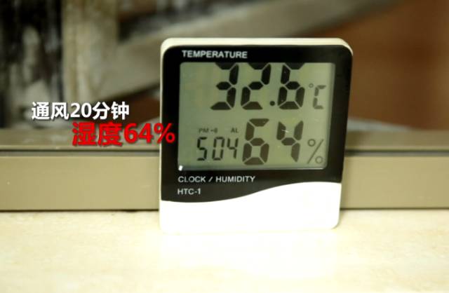 通风20分钟,卫生间的湿度也仅仅下降到64%。