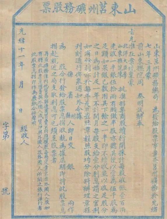 山 东莒州矿务总局为发行股票事 案查莒州矿务于光绪七年三月蒙前山东抚院周 奏明试办,奉 旨允准在案。 现禀蒙 北洋大臣李山东抚院周(此处竖排并列)批准召集商股续行开采。计每股收银壹百两,先收一半银五拾两。有愿做半股亦听其便。以壹万五千股为足额。如果银已敷用,其下余之一半即不续收。并以收足股份之日为始计足一年,不计闰月,每股支给壹分利息,谓之官利。如有余利,亦于每年是日查照章程照股均分。除将办理章程刊刻通裨众周知外,今据 系 省 州县(此处并列)人,即日交银 两,作为 股。合行发给股票息折收执为据。届期即持此股票息折赴就近之局支取利息可也。须至股票者。