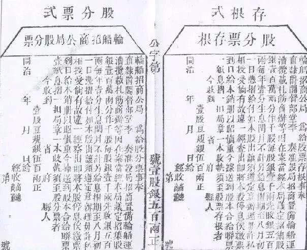 可能受最早成立的轮船招商局影响的缘故,这4家企业虽然成立年份不同,但4份股票在形制、 格式和行文内容方面都相当一致。如票面形制都很朴素,除文字和标题外,没有更多的图案装饰,文字四周用线条圈围,圈围出来的票面形状与清代过去流行的当票、 煤窑的窑照和盐商的执照等几乎完全一样。显然,新型股份制企业的股票采用这种历经官方认可、 又被社会熟知承认、 具有法律效力的凭证和执照的形制,与从法律方面保障其有价证券性质的考虑分不开。它和下面介绍的股票文体中采用官方告示性语言,以及在操作方面的严格规定一起,构成了股票作为有价证券的法律依据。从股票的格式上看,标题名称均由右往左横书,其余文字竖排。股份票与股份票存根为二联票,二者并排印刷。股份票在左,存根在右,内容几乎完全相同,只是标题名称与行文中的个别文字有异。关于股票发行的有关规定和程序,最早成立的轮船招商局局规中有如下记载:“本局刊立股份票、 取息手折,股各收一纸,编列号数,填写姓名、 籍贯,并详注股份册,以杜洋人借名。其股票息折,由商总商董会同画押,盖用本局关防,以昭凭信。如有将股让出,必须先尽本局,如本局无人承受,方许卖与外人,一经售定,即行到局注册。但不准让与洋人。设遇股票息折遗失,一面到总局挂号,一面刊入日报,庶使大众咸知。俟一月后准其觅保出结,核对补发。”轮船招商局的这些规定,实际上为此后成立的股份制企业树立了 “范本”,除 “股各收一纸” 即认购一股付给一张股票,以及遗失股票需补发的规定看来因烦琐或过分严厉而被修改取消外,其他内容包括禁止将股票卖给洋人的规定基本上都沿用下来。