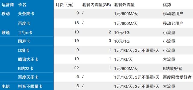 注:①流量均为全国流量,部分需要充值和入网达一定月份后升级;②如果同一家互联网公司合作的互联网卡有好几种,选最基础的一种进行比较。