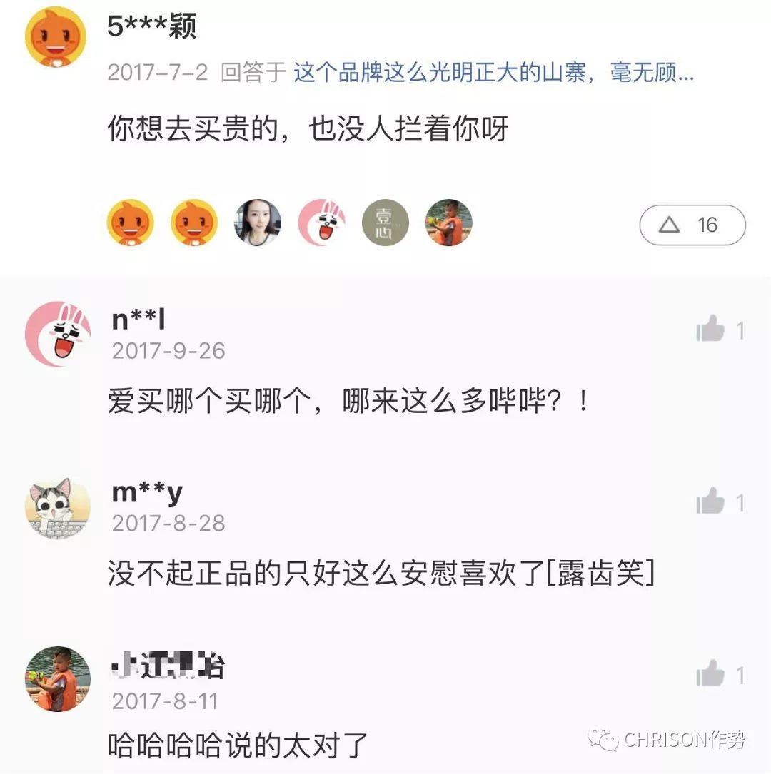 国产名牌公然抄袭让人气愤,部分消费者的态度更令作势君哭笑不得。当有人留言对这种抄袭提出质疑时,有买家们竟说:你想去买贵的,也没人拦着你。