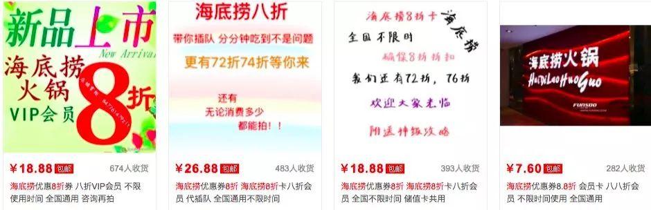 海底捞8折优惠:直接在淘宝上搜索海底捞8折优惠,花20元左右拍下商品,店主会发你一个海底捞的会员账号,用它的这个会员账号,在全国绝大都数的海底捞门店都可以享受8折优惠,不限制时间,但是需要提前和店主沟通好,如果人多的话,这个优惠力度也不错!