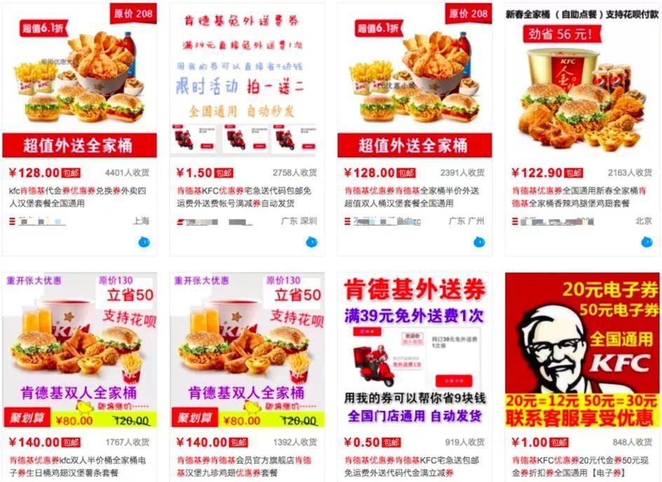 如果大家喜欢吃肯德基,可以在淘宝上搜索“肯德基优惠券”,一般有以下这些套装和优惠券可以购买: