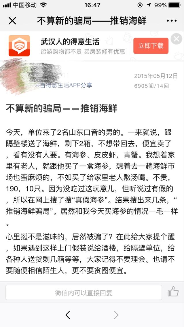 2015年5月,湖北武汉一位网友在当地论坛发帖:单位来了2名山东口音的男性,称给隔壁楼送海鲜,剩了2箱,有海参、皮皮虾,青蟹,不想带回去,打算便宜卖,看有没有人要。网友想着家里有老人,就买了一盒海参,190元10只。因为没吃过,听说有假货,结果上网一搜“真假海参”,就搜到了类似案例,心里很不是滋味。