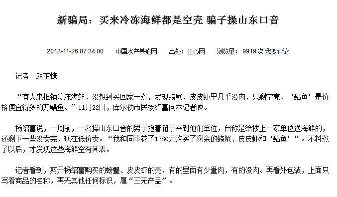 2013年11月,*疆新**库尔勒市有市民爆料,一名操山东口音的男子抱着箱子到单位,自称是给楼上一家单位送海鲜,还剩下一些没卖完,低价卖。该市民和同事花了1780元购买了剩余的螃蟹、皮皮虾和“鲳鱼”,不料煮了以后,发现螃蟹、皮皮虾几乎没肉,只剩空壳,“鲳鱼”是价格便宜得多的刀鲳鱼,再看外包装,上面只写着商品的名称,再无其他任何标识,属“三无产品”。