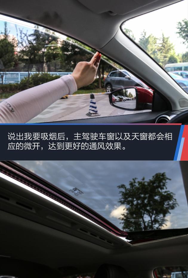 名爵6的斑马系统带有一个吸烟模式,只要说出我要抽烟,车会自动把主驾驶车窗降一点,同时把天窗开启一个角度,使车内通风。不过如果说我想抽烟,系统还会提示你抽烟有害健康,点个赞。
