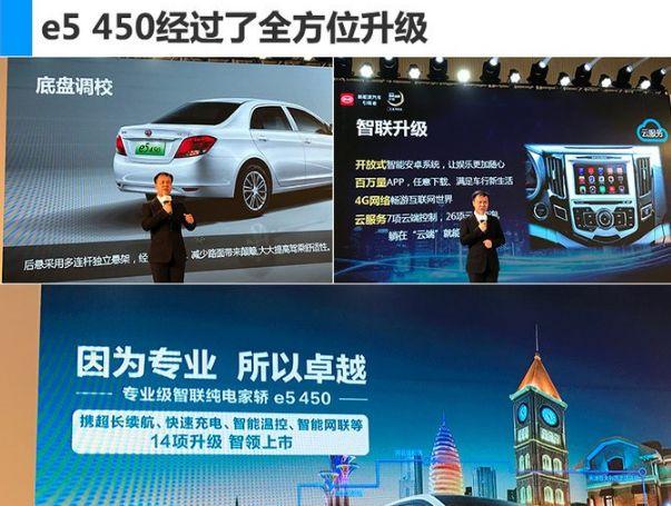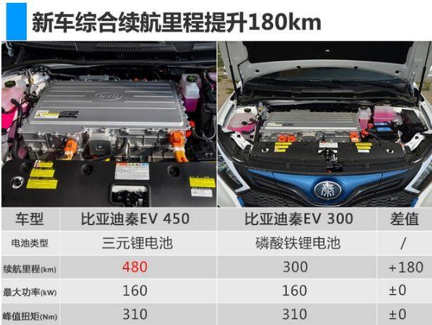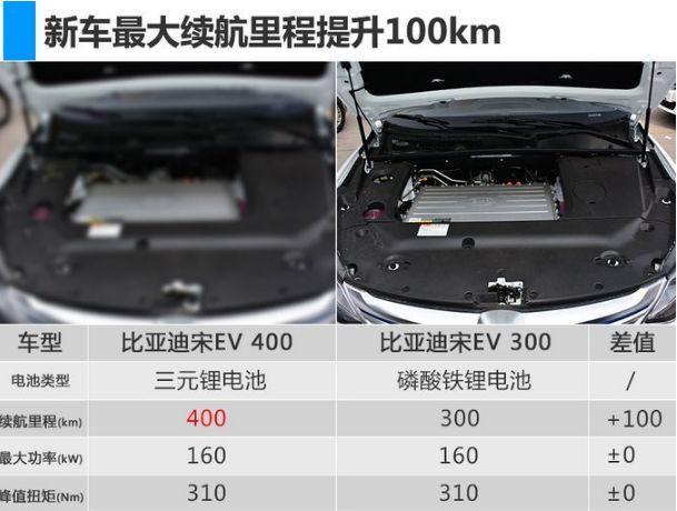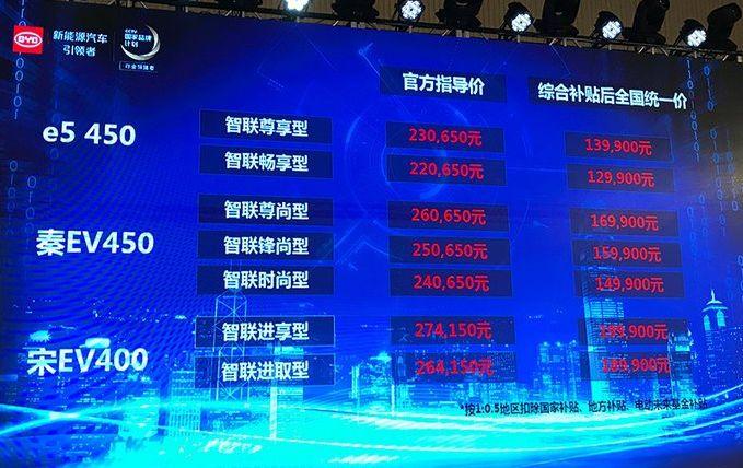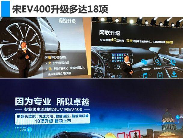 2018年3月31日,比亚迪秦EV450、e5 450以及宋EV400三款纯电动车型正式上市,官方指导价区间分别为24.065万元-26.065万元、22.065万元-23.065万元和26.415万元-27.415万元,补贴后售价区间分别为14.99万元-16.99万元、12.99-13.99万元和18.99万元-19.99万元。三款新车搭载了比亚迪最新的电池智能温控管理系统,且由磷酸铁锂电池升级为三元锂电池,续航里程均有不同程度的增加。新车官方指导价有所调整,其中宋EV400各款车型均降价1750元。