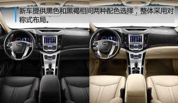 内饰部分,比亚迪e5 450提供黑色和黑褐相间两种配色选择,整体采用对称式布局,中控台配有液晶显示屏并融入了大量镀铬装饰元素。方向盘采用三辐式设计,内部加入手动物理按键。