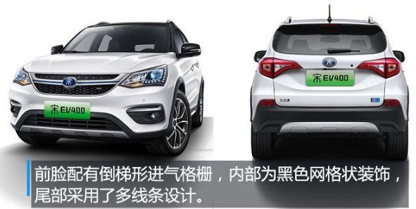 比亚迪宋EV 400前脸采用了倒梯形进气格栅,内部为黑色网格状装饰,中部装饰条平行贯穿其中,并与两侧大灯相连。前大灯为多边形,内部融入了LED光源,点亮后颇具辨识度。车身侧面线条简约,轮眉及车窗四周均带有黑色装饰,尾部采用了多线条设计,大灯为鹰嘴状,与多边形大灯形成了呼应。
