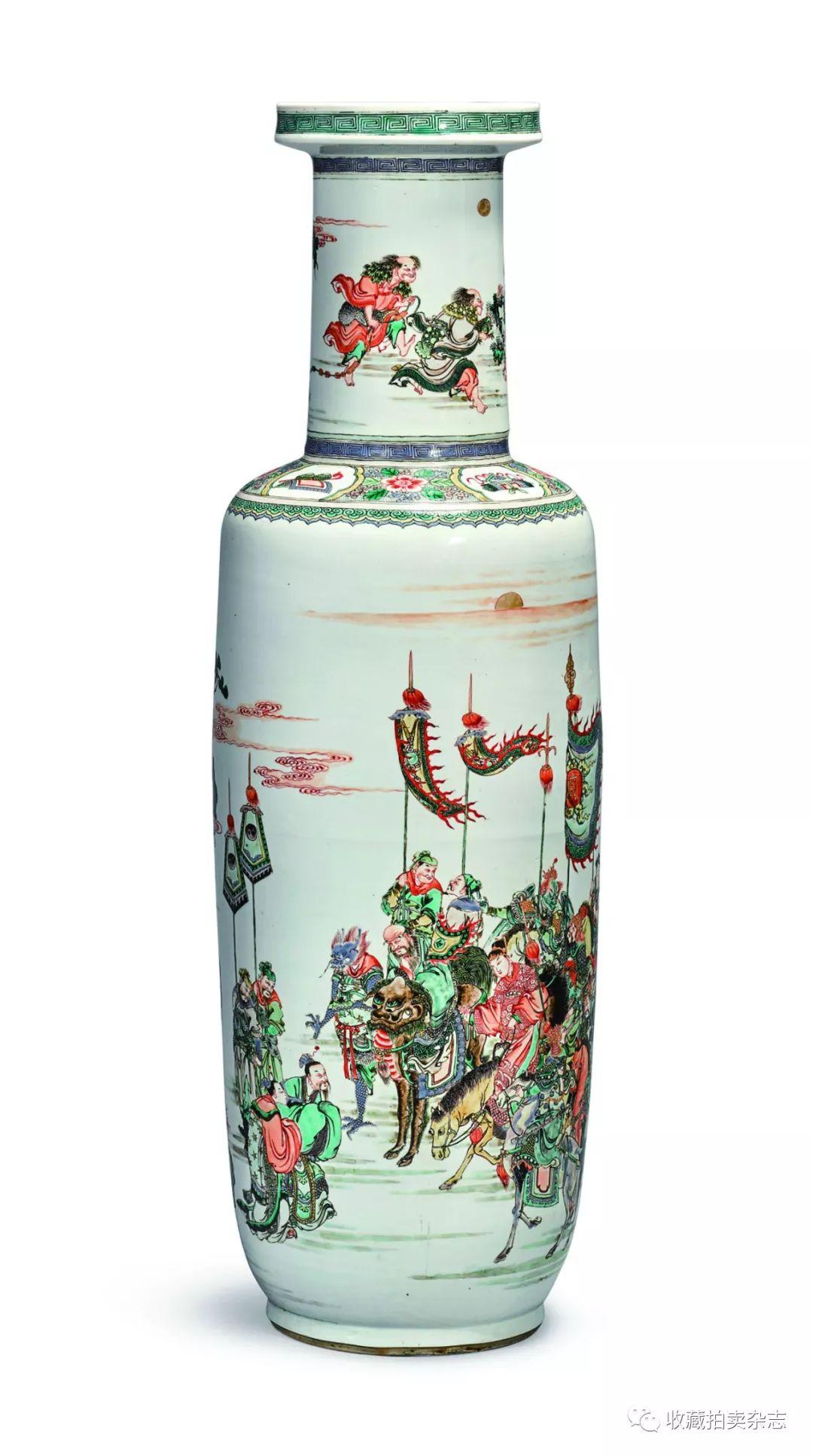 清康熙五彩“叩马阻兵图”大棒槌瓶在拍卖现场备受藏家追捧,最终是以远超估价的157.5万美元(折合人民币997.4万)成交,拍卖前估价为40-60万美元。瓶身所绘的“叩马阻兵”故事典故取自于《封神演义》一书,此书着于十六世纪,讲述的是商末纣王昏虐,文王伐纣,其子武王立周等故事,以史实为根据,创造出诸神、妖兽等,斗法争权。