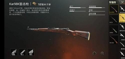 98K算是拉栓*击狙**枪中最常见的一把,在地图中刷新率低,二级头和一级头满血被狙中,都是一枪致命。打身体需要二到三枪,射速快,但是载弹量只有5发,配件有枪头和枪托,装上98K*弹子**袋会减短装弹时间。在游戏中,操控比较复杂,因为大部分时间你只有一两枪的机会。