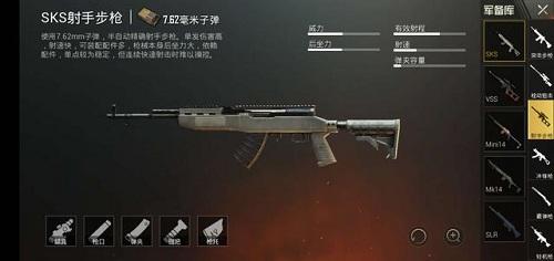 SKS属于半自动精准射击步枪,俗称连狙,虽然是*击狙**枪,但是不需要拉栓,可以连续开火。SKS伤害比起常规的步枪算是比较高的了,打头两枪,打身体三到五枪,满配SKS稳定性很高,适合中距离作战。而且它现在也能装步枪的配件了,所以满配起来比较容易,在游戏中比98K更受玩家们喜欢。