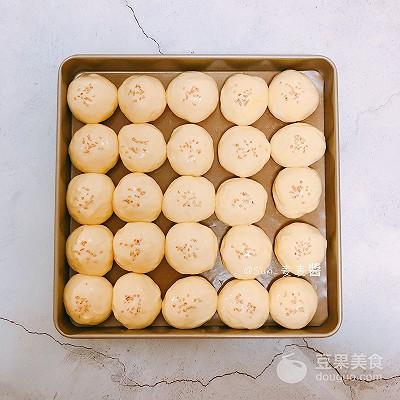 4、将面团取出排气后分成25个小面团,放入铺油布的烤盘中,烤箱发酵至2倍大,烤箱不插电,放碗开水即可