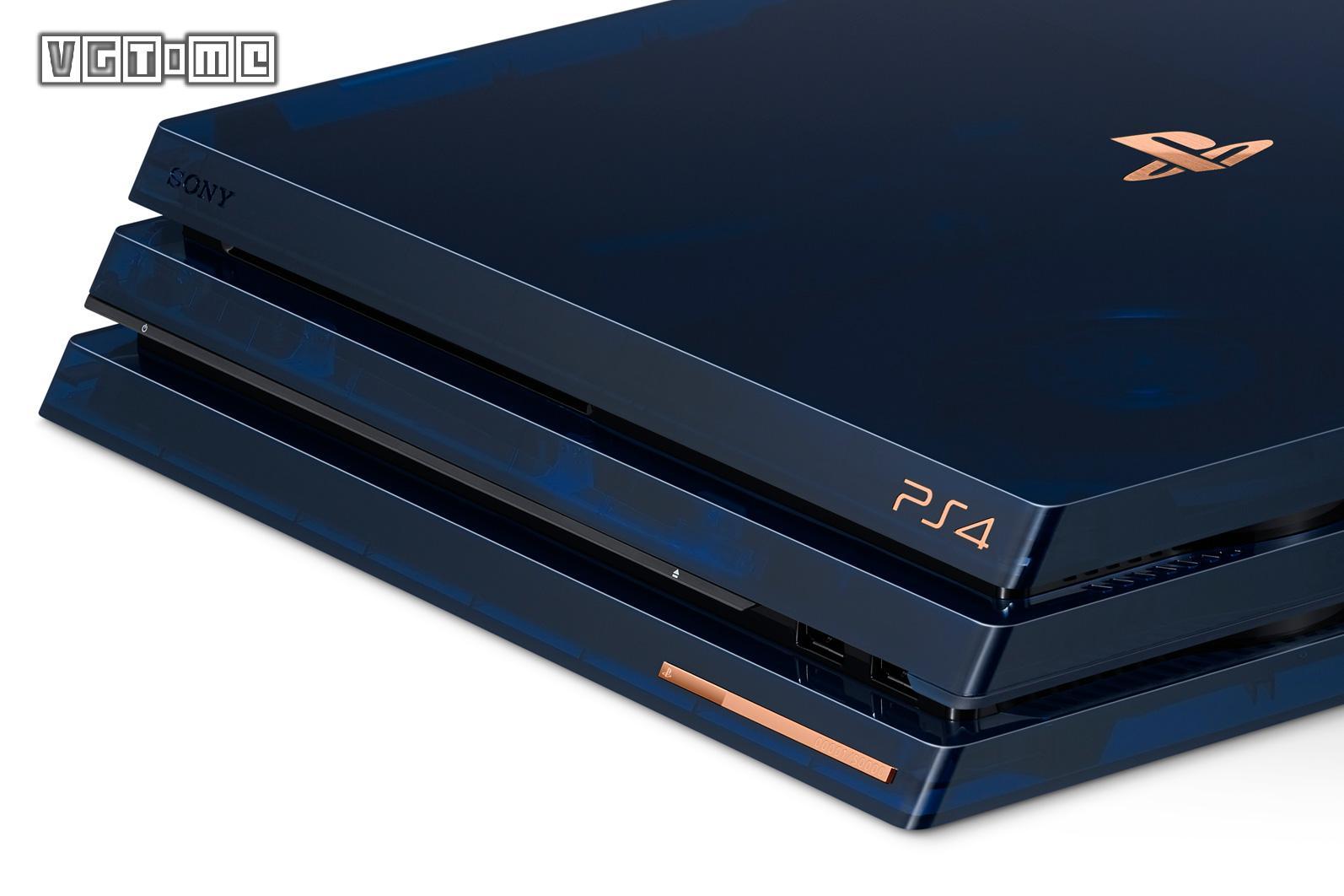 该主机内含 2TB 硬盘,采用深蓝色半透明设计,当启动电源时,主机内部高亮度的蓝灯将会亮起,用户可以欣赏到 PS4 Pro 主机内部的精密构造。顶部表面 PS 标志,以及主机正面的 PS4 字样均采用哑光纹理铜色。