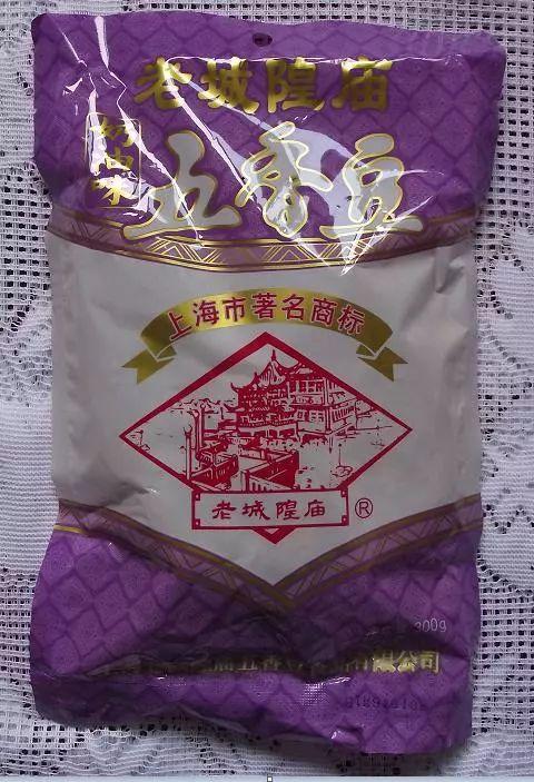 紫色的塑料袋包装上,印着老城隍庙建筑样式的标识,袋子中间有一部分是透明的,能看到里面装着的五香豆,棕褐色的皮,白花花的盐霜,豆荚口是一条粗短的黑色。