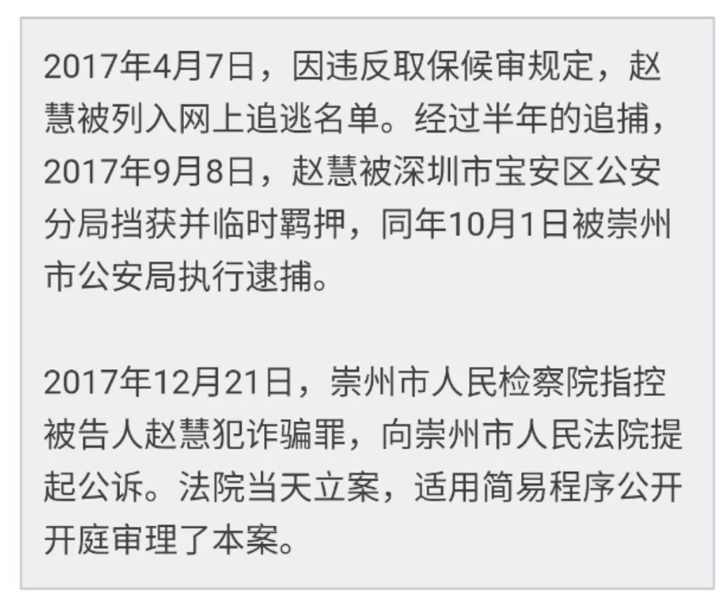 2016年8月10日,赵慧因涉嫌诈骗罪被崇州市公安局刑拘。此时,43万元已被挥霍一空。