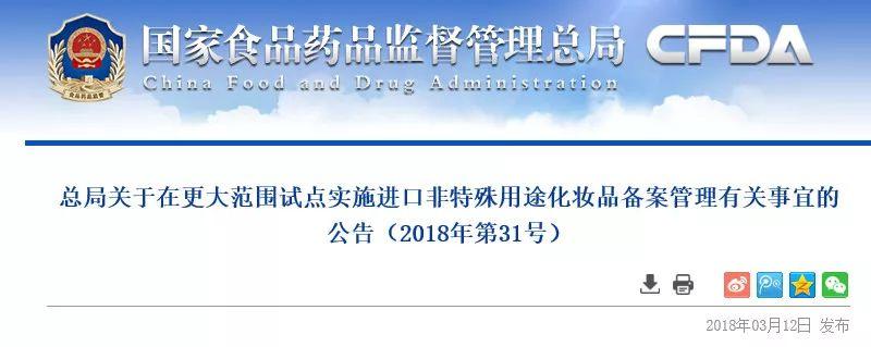 近日,国家食药监总局发布《关于在更大范围试点实施进口非特殊用途化妆品备案管理有关事宜的公告》,授权浙江开展进口非特殊用途化妆品审批管理调整为备案管理试点。