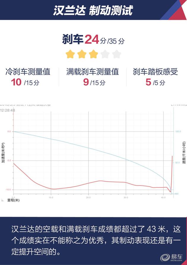 在我们的超级测试中,汉兰达的制动成绩并不让人满意,其空载冷刹车达到了43.2米,满载刹车达到了44.5米。实际的驾驶感受中,刹车踏板偏软,制动力反应较为迟缓,给人的信心不是很强。这虽然跟它较大的自重不无关系,但它的制动性能依然有待提升。