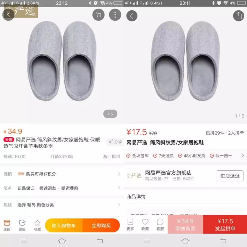 一款男士棉拖鞋在拼多多上(右)的拼团价是17.5,只售出29双,而这款产品在天猫上(左)的售价为其两倍,月累计销售量3370件。