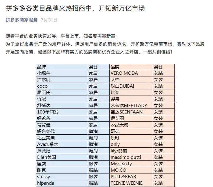 7月最后一天,拼多多商家服务官方账号连发两则公告,向近500个品牌商发出定向招商邀请。