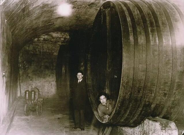 张裕第三代酿酒师巴狄士多奇(左)与工人在酒窖留影