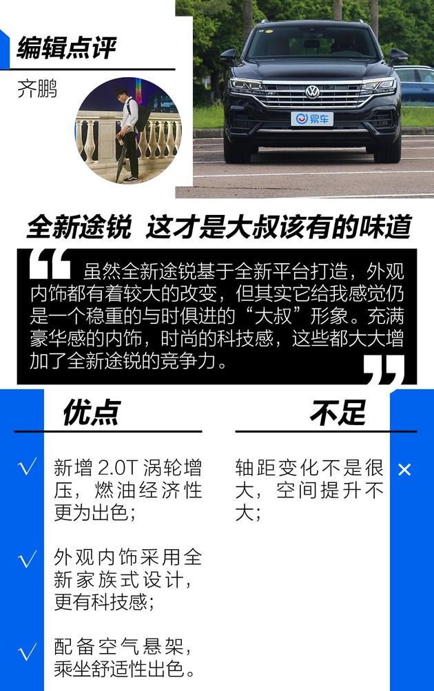 提起大众途锐,就会让人不由得想起“大叔”的形象。它没有张牙舞爪般极具进攻性的设计语言,内饰也没有足够强的运动氛围,但它的品质以及带给你的沉稳的感觉,却是其他车型所不能及的,这或许才是它迷人的地方。如今,全新途锐已正式上市,如同换上了精致的西装,同时还增添了几分科技感,动力系统新增了2.0T的四缸涡轮增压发动机。那么这位魅力“大叔”的处世之道,能否征服现今的消费者呢?
