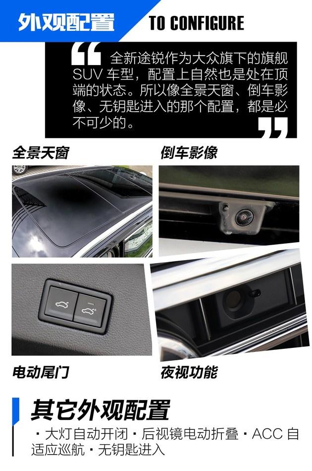 外观小结:全新途锐的外观还是保持着一个“大叔”该有的感觉,但相比于之前它要更加的精致,同时线条也更为硬朗。同时,新车的外观配置上也是十分的丰富,全景天窗、无钥匙进入以及较为特别的夜视功能。虽说全新途锐在外观上保持着一贯稳重大气的同时,还有着很多的配置。