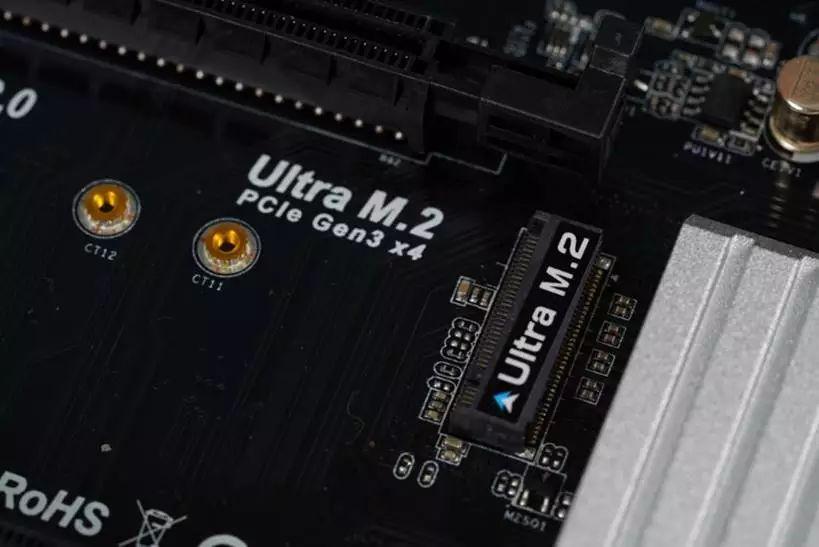 下图中,华擎这张主板在PCB上直接有标识PCI-E gen3 x4,这什么意思呢~PCI-E是支持PCI-E通道的硬盘,gen3是接口是PCI-E 3.0,x4,也就是上文所述的M-key,也就是支持顶级的M.2接口的固态硬盘,比如SM961,960pro这种。