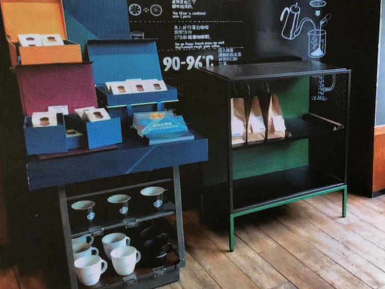 门店的制作台专门辟了一块来打包外卖订单,冷饮、热饮、食品会分开打包好之后,店员会将打包纸袋放置在门店入口处的铁架上,方便配送员取走。整个过程大致在三分钟左右完成。
