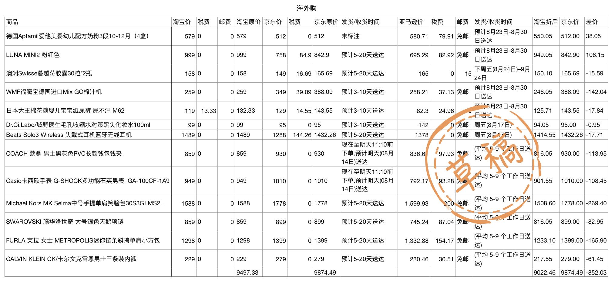 然后我们在天猫和京东平台分别挑选了 14 个相同的商品,记录下它的售价、进口税费、运费和送达时间。计算出每个商品的价格和两个平台的差值,并分析。