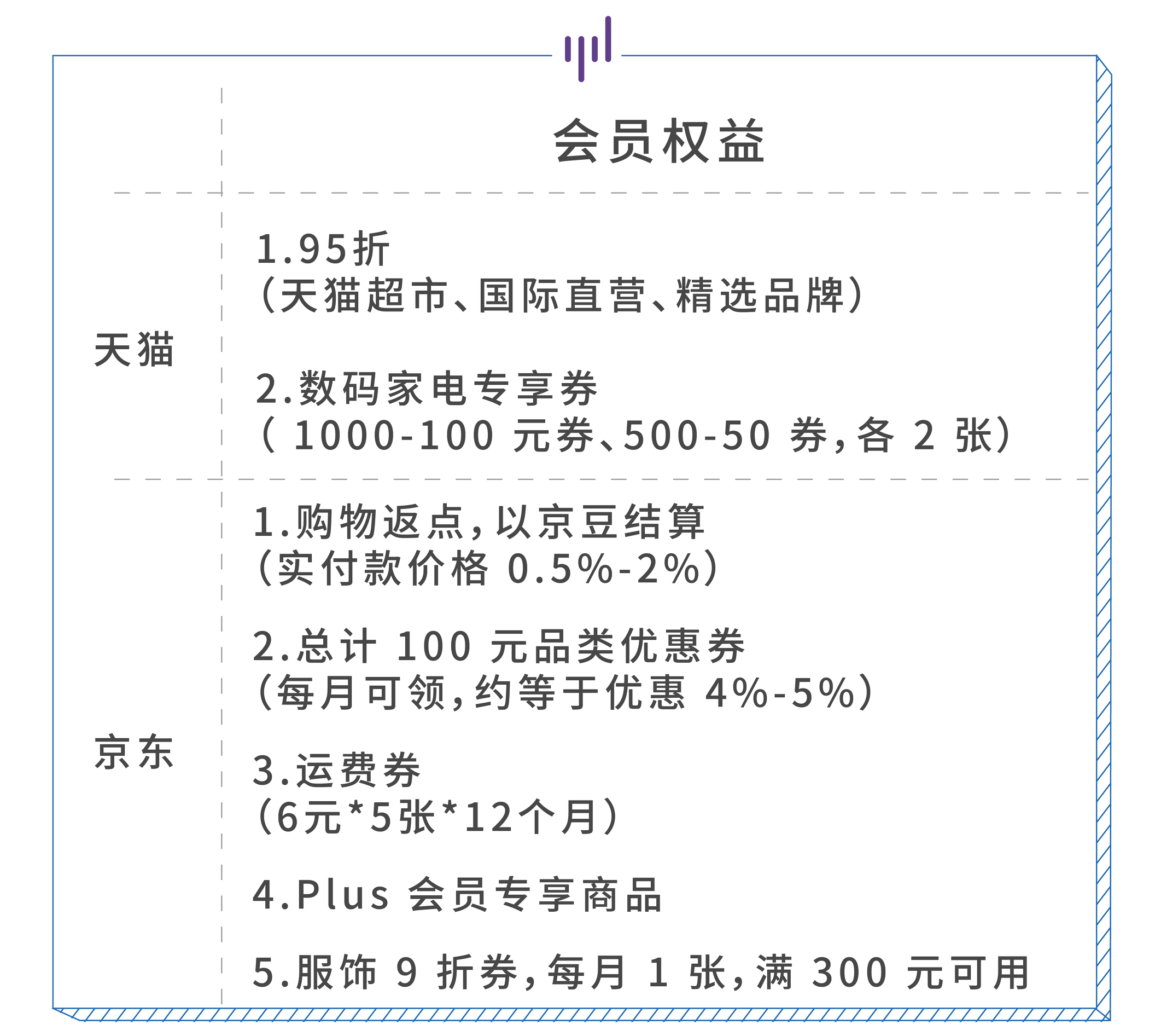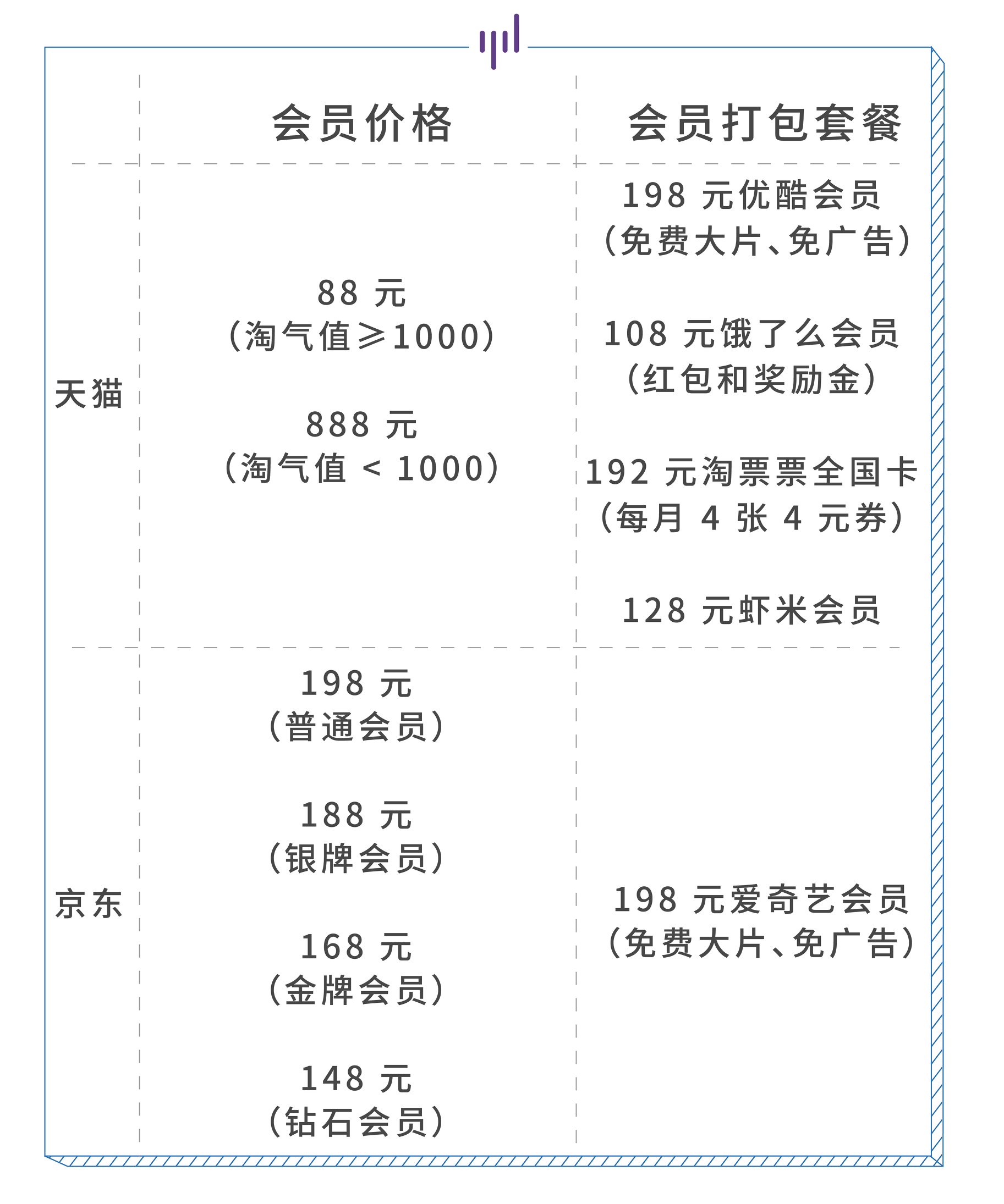 如果你网上消费比较多,还是很值的。先来看一下这两个平台会员的售价和权益。