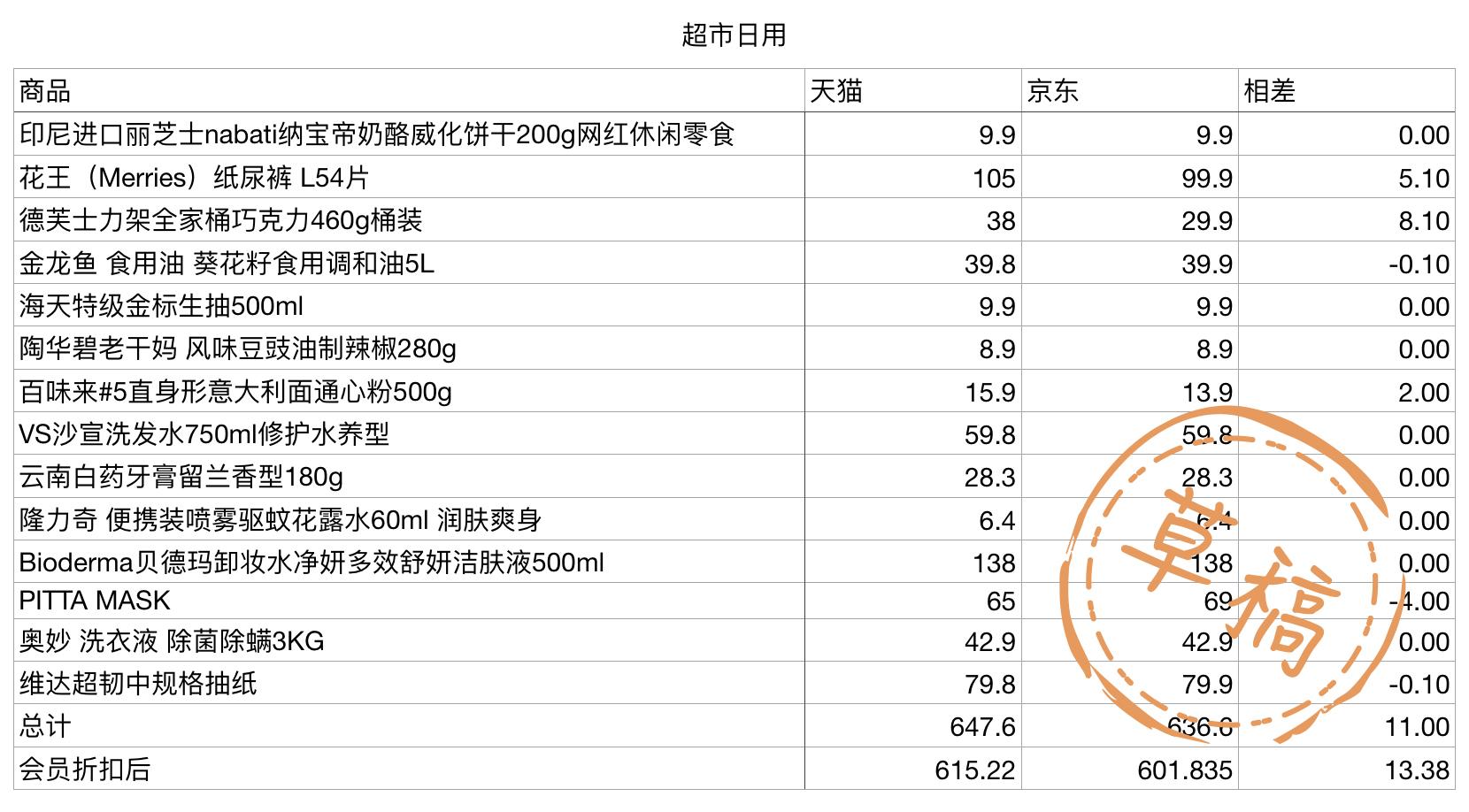 我们同样在京东和天猫超市挑选了 14 个商品,并计算出使用会员权益购买他们的价格并分析。