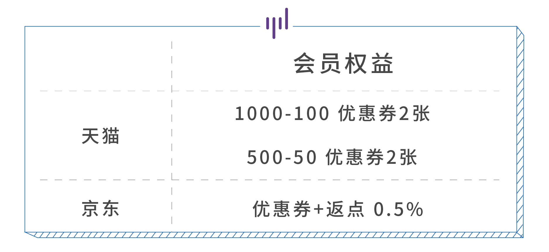 以下是两个平台数码家电类产品的政策,天猫购买会员以后,可以拿到满 1000 元减 100 元券、满 500 元减 50 元券,每档 2 张,这 4 张券不能叠加使用,有效期一年,可以用来买指定商品。券使用完以后,天猫就没有别的优惠了。