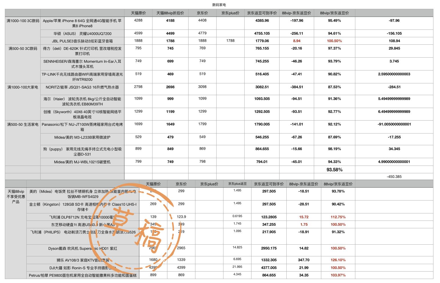 (这里补充解释一下上面表单里面提到的京东品类优惠券,有 5 个面额可以随意搭配,每个月领取的数量是不限的,但总价值不能超过 100 元。我们大致算了一下,每张券相当于优惠 4%-5%。)