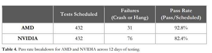 最后的测试结果中,AMD显卡在432项测试中有31项测试失败,通过率为92.8%,NVIDIA这边则是76项失败,通过率82.4%。