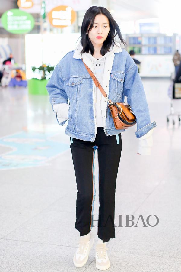 刘雯机场街拍:身着李维斯 (Levi's) 牛仔外套,搭配Off-White连帽卫衣