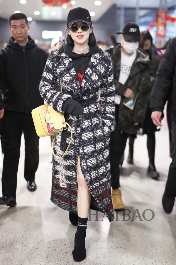 宋茜机场街拍:身着香奈儿 (Chanel) 格纹大衣,搭配维特萌 (Vetements) 2017秋冬系列印花卫衣
