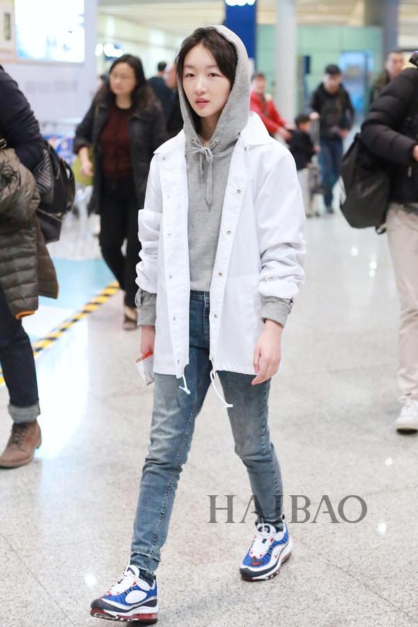周冬雨机场街拍:身着Undercover白色外套,搭配埃斯普利特 (Esprit) 灰色连帽卫衣