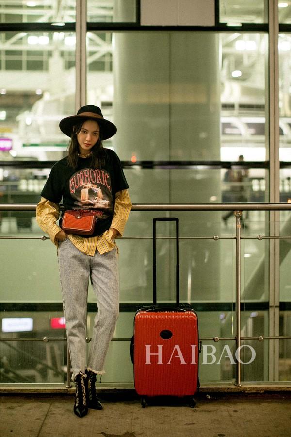 欧阳娜娜机场街拍:身着Sacai拼接衬衫,搭配Forming 卫衣