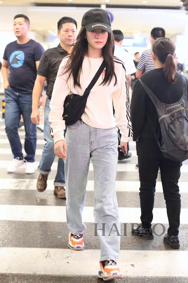 关晓彤机场街拍:身着Miss Sixty牛仔外套与白色连帽卫衣