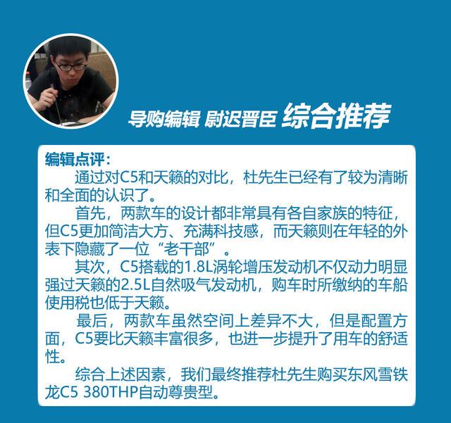 小结:通过对比不难看出,两款车有着不同的性格,虽然底盘结构相同,调校也偏向舒适,但是搭载1.8T发动机和6挡手自一体变速箱的C5在保障舒适的前提下动力明显更有优势,而天籁的2.5L自然吸气发动机+CVT变速箱的动力组合,需要你驾驶更“佛系”一点。所以在动力表现和底盘配置方面,C5更符合杜先生的需求。