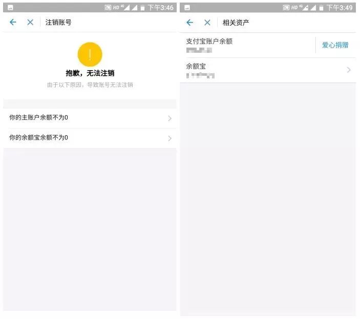 2.点击“下一步”,开启注销账号,如果失败的话,支付宝会给出具体原因,比如我这里显示由于主账户和余额宝的余额不为0,导致无法注销。选择对应的原因,支付宝官方还给出了“爱心捐赠”的功能,帮助用户清空余额。