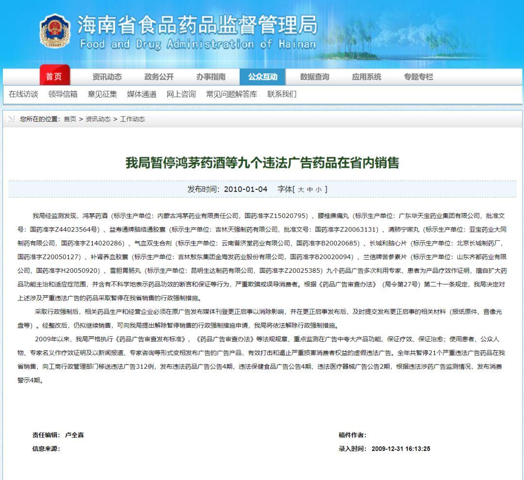 2010 年被海南省药监局处罚