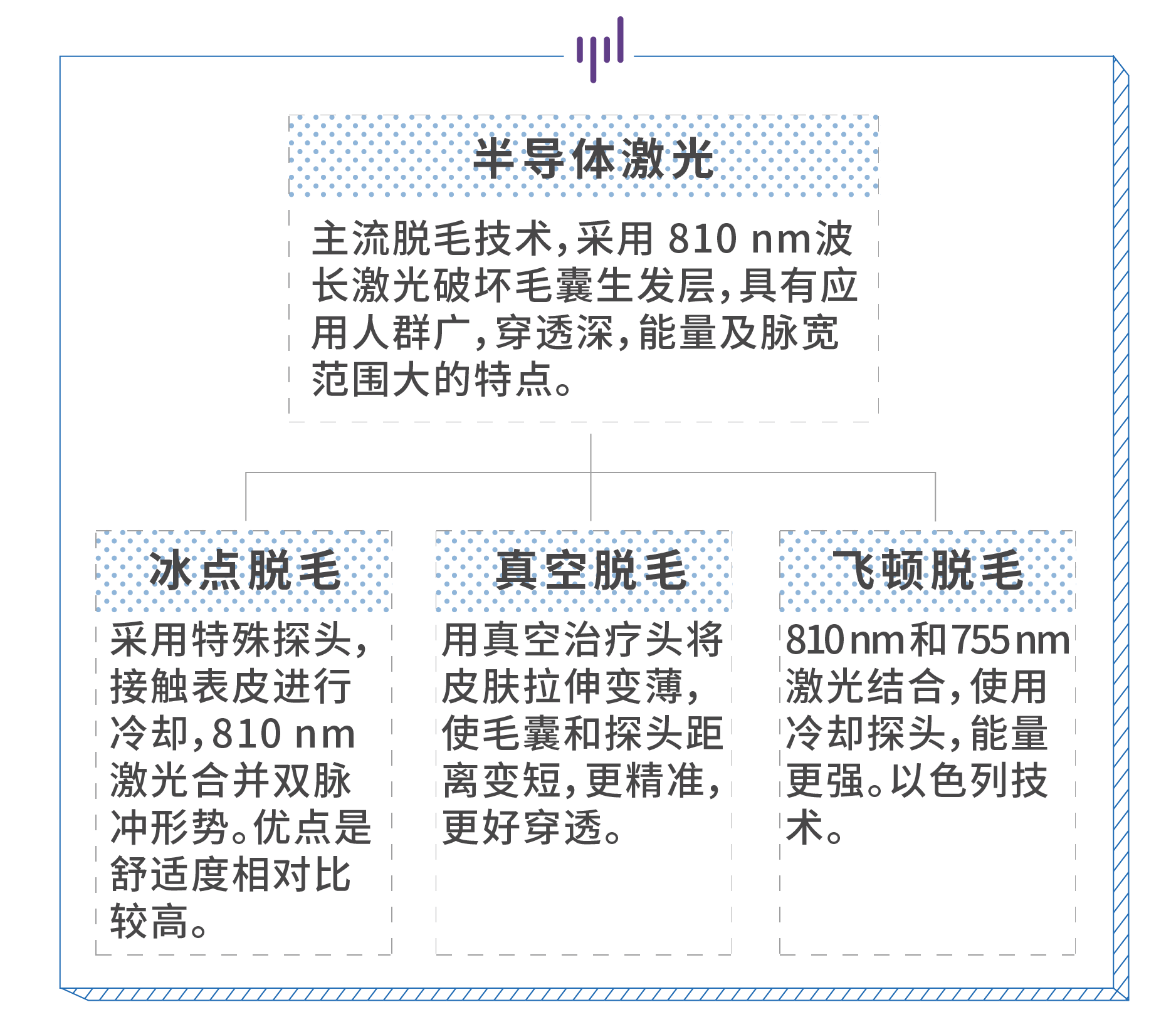 目前的脱毛项目使用的技术主要以半导体激光为主,常见的一些脱毛项目,如冰点脱毛、真空脱毛、以色列飞顿脱毛,都是在半导体技术上的优化技术。具体可以看下图: