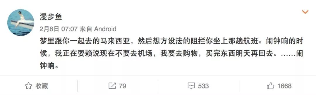 微博有一位叫“漫步鱼”的失联家属,她一直都没有放弃,一直在等待,这种耐心让人看了也是痛心。从2014年到现在,她未曾放弃,她的每一条微博都在等他,他到底什么时候才能回家...
