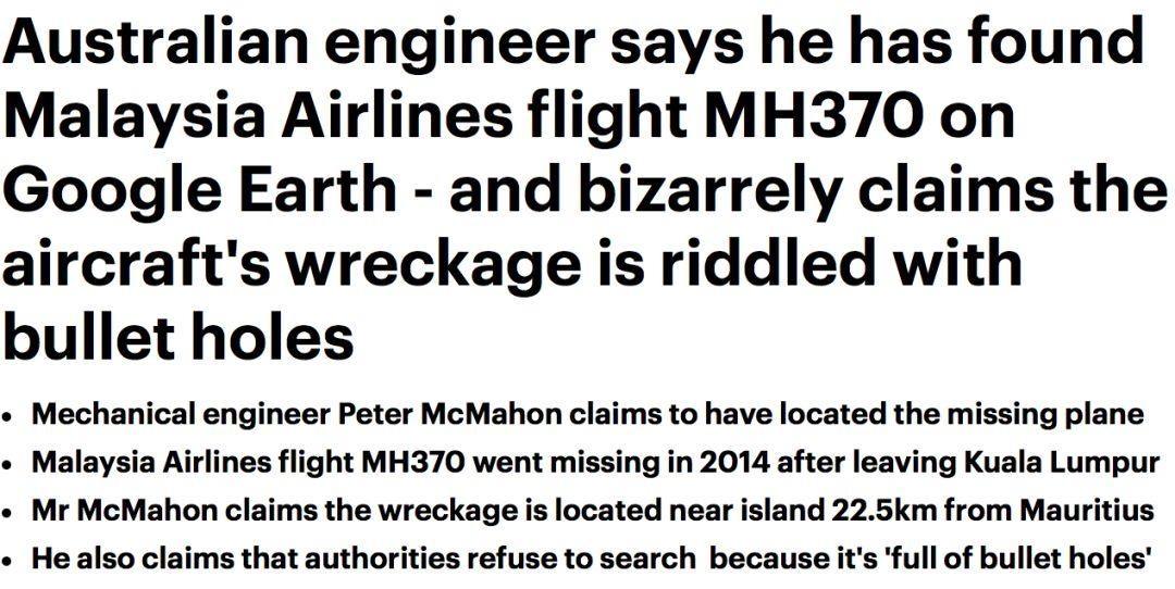 一位已经参与了25年灾难调查的64岁的澳大利亚调查工程师Peter McMahon 表示他已经使用Google Earth找到了马航MH370航班,这架飞机的残骸位于毛里求斯以北22.5公里处的海域,也是一个未被搜查过的海域。